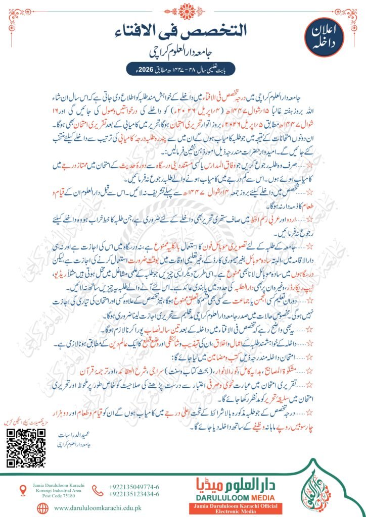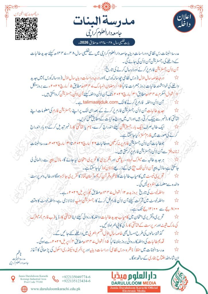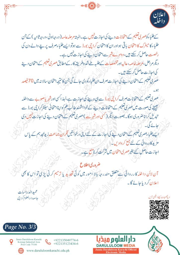- نیز واضح رہے کہ طلبہ جامعہ دار العلوم کراچی کو عصری مضامین کے امتحان دینے کی قبل از وقت اجازت حاصل کرنا ضروری ہے البتہ دورہ حدیث اور موقوف علیہ کے شرکاء کو ایسے کسی امتحان کی اجازت نہیں ہے۔